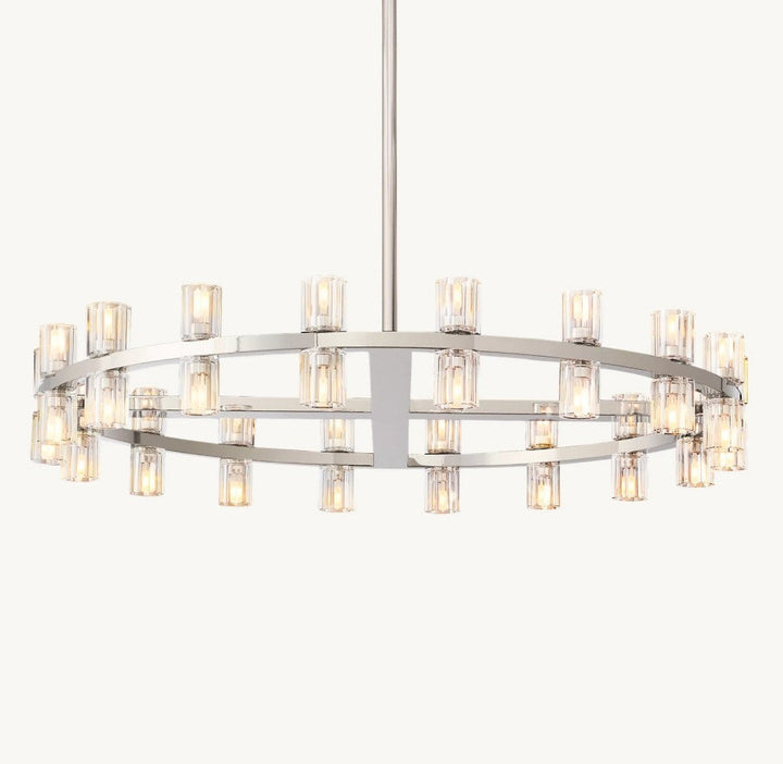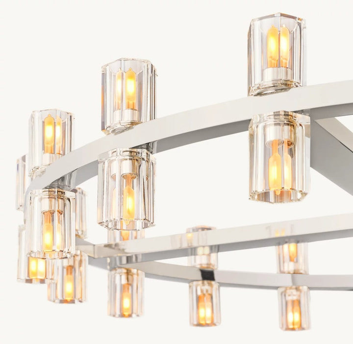 Inspired by the form and scale of industrial gears, the Arcachon collection features hexagonal crystal-glass spokes with rounded interiors, set along a sleek solid-metal frame. The balance of geometry and negative space creates a refined, architectural statement.