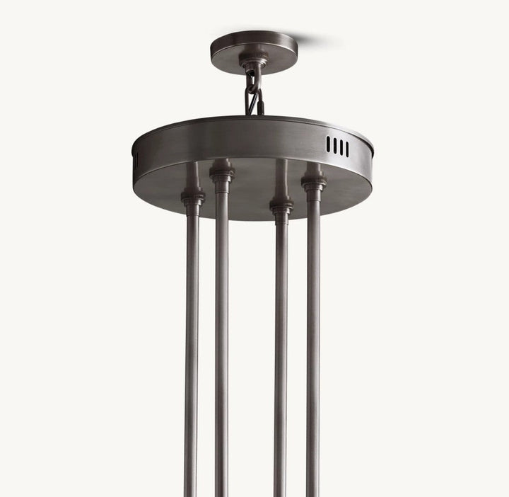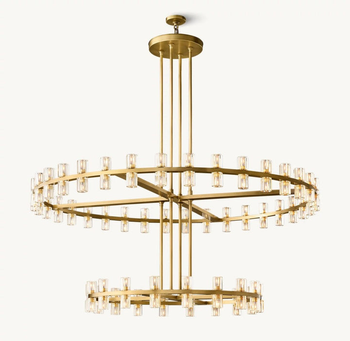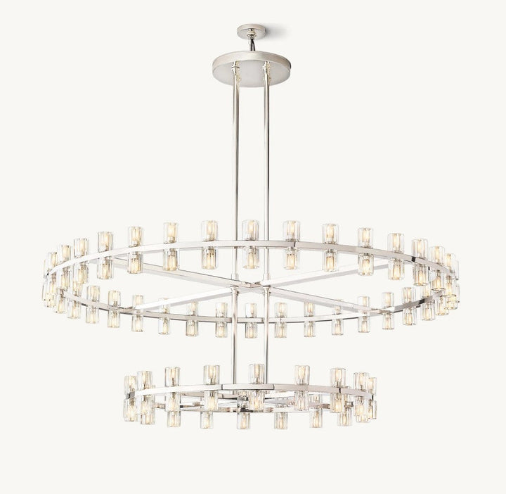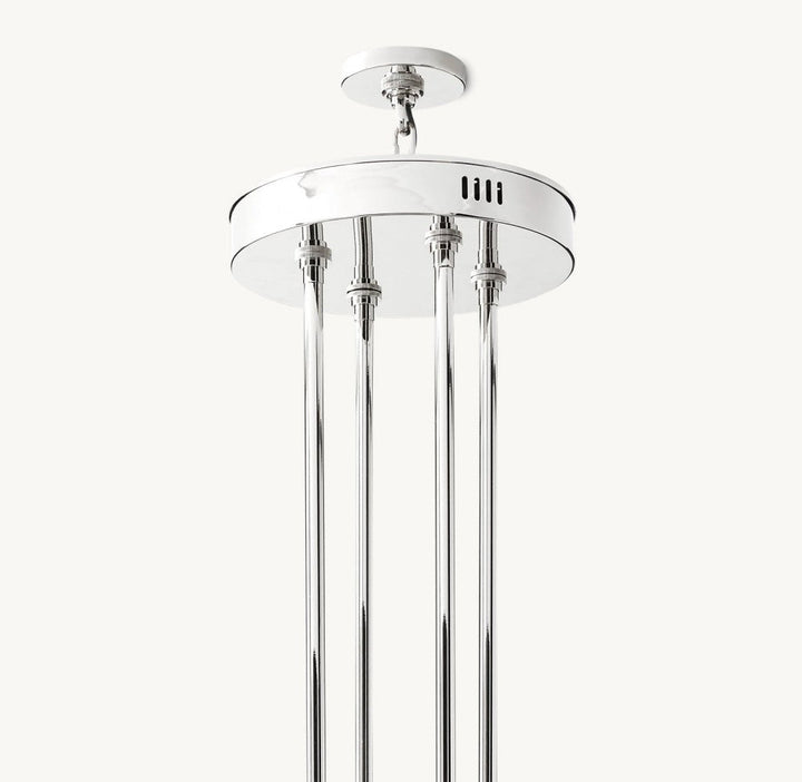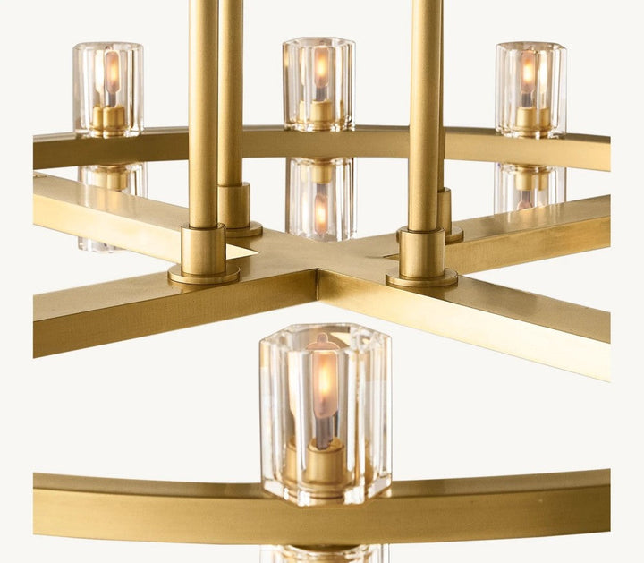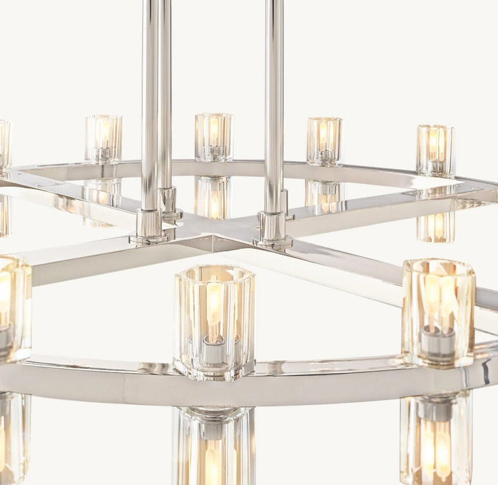 Inspired by the form and scale of industrial gears, the Arcachon collection features hexagonal crystal-glass spokes with rounded interiors, set along a sleek solid-metal frame. The balance of geometry and negative space creates a refined, architectural statement.