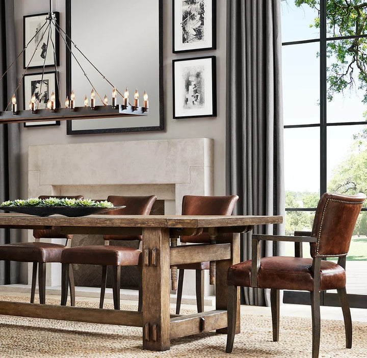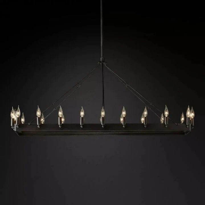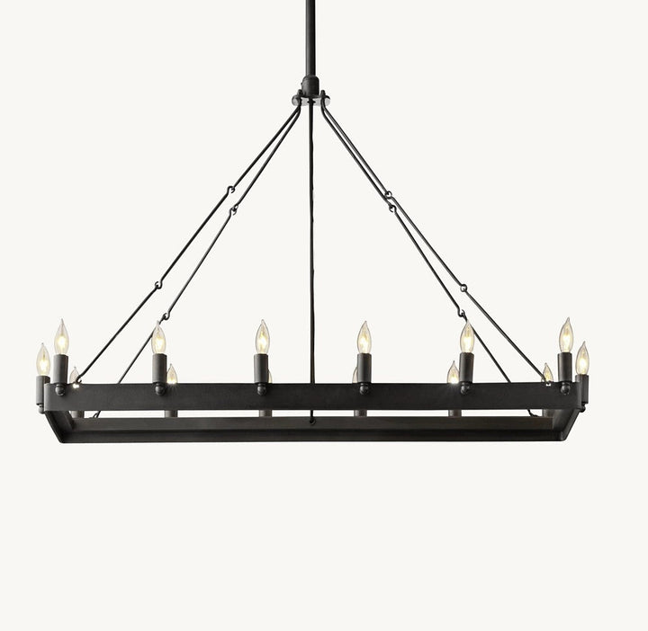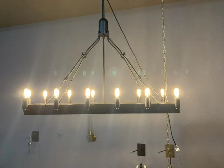 Rustic yet refined, this hand-forged chandelier draws inspiration from early 20th-century industrial fixtures. Crafted from sturdy angle iron, its bold form and grand scale make a striking statement in any space.