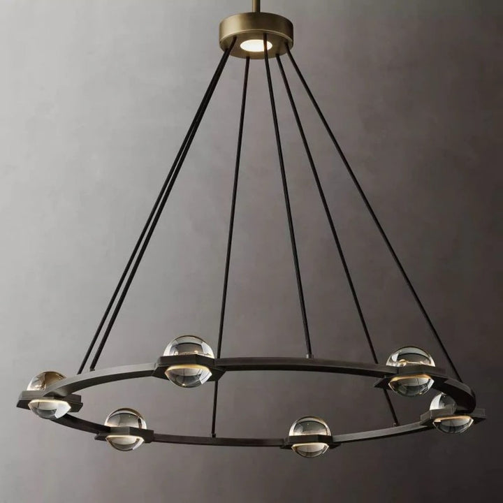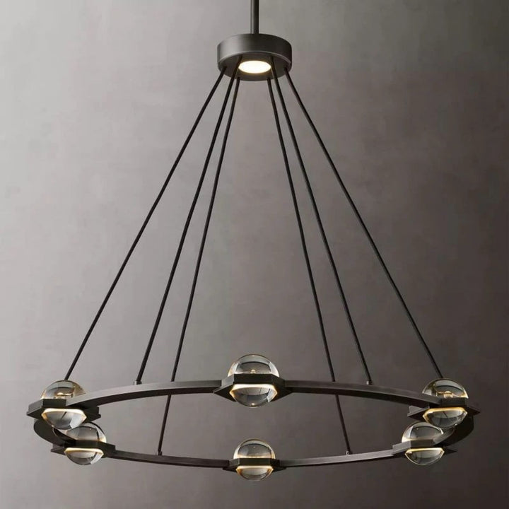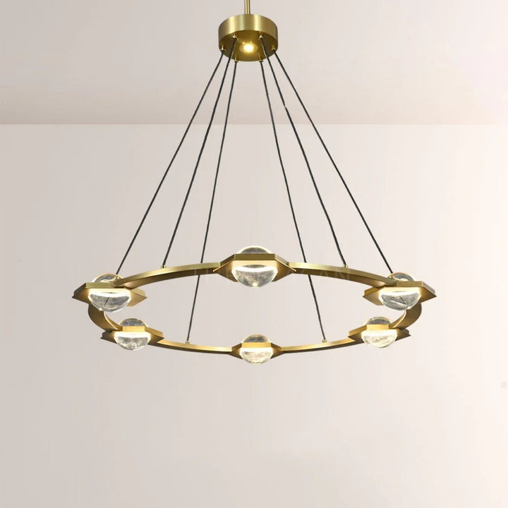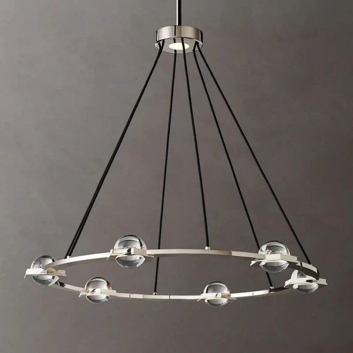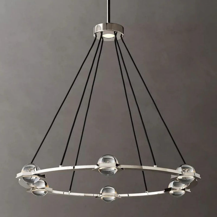 The Eclavor collection embodies a balance of geometry and light. Crystal orbs are elegantly suspended within hexagonal metal frames, creating a composition that feels both architectural and ethereal. Inspired by visionary neoclassical forms, the design celebrates structure, symmetry, and the quiet brilliance of illuminated crystal.