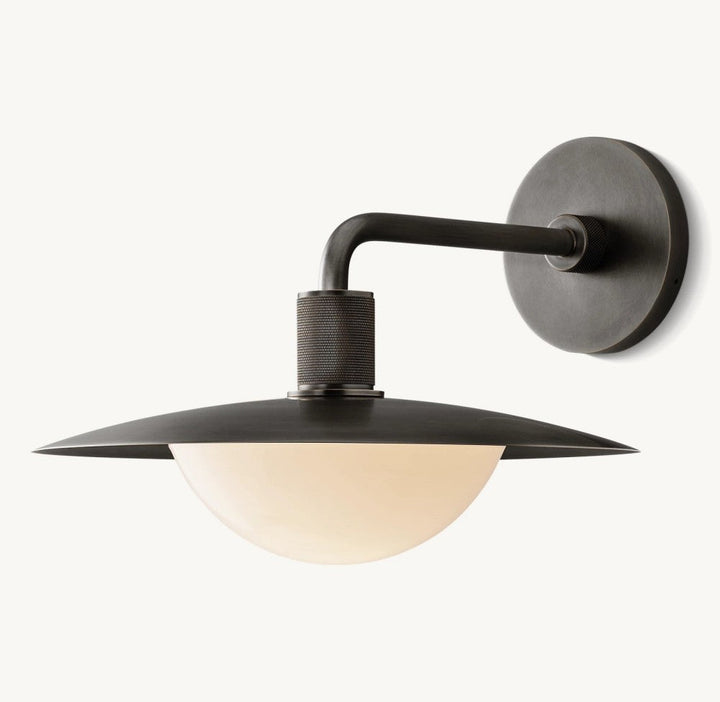 A modern take on the barn lamp, crafted in solid brass with knurled detailing and a milk glass shade that casts a warm, diffused glow.