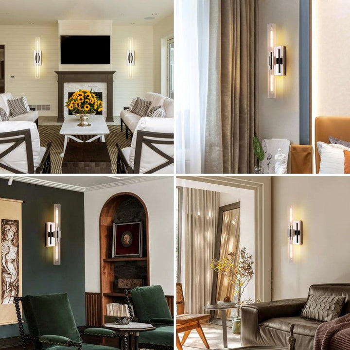 Pairs hand-blown clear glass shades with solid brass fittings, blending Art Deco elegance and modern minimalism. Warm light reflects through each finely crafted shade, creating a refined and timeless ambiance.