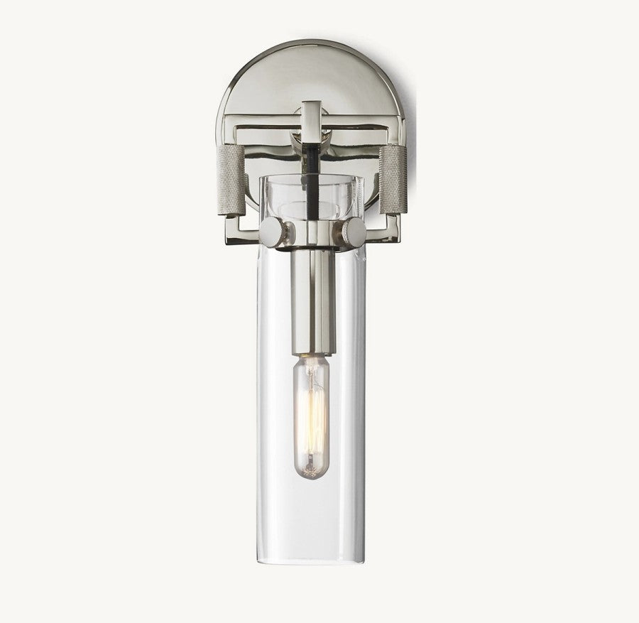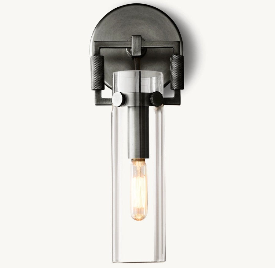 A study in positive and negative space, density and openness, strength and fragility, our Machinist Sconce is a yin and yang exploration. Crafted of solid metal, the geometric yoke reveals its industrial inspiration. In contrast, the clear glass surround is barely there, echoing the form of a shade. An Edison bulb housed within reveals arresting filaments of light.
