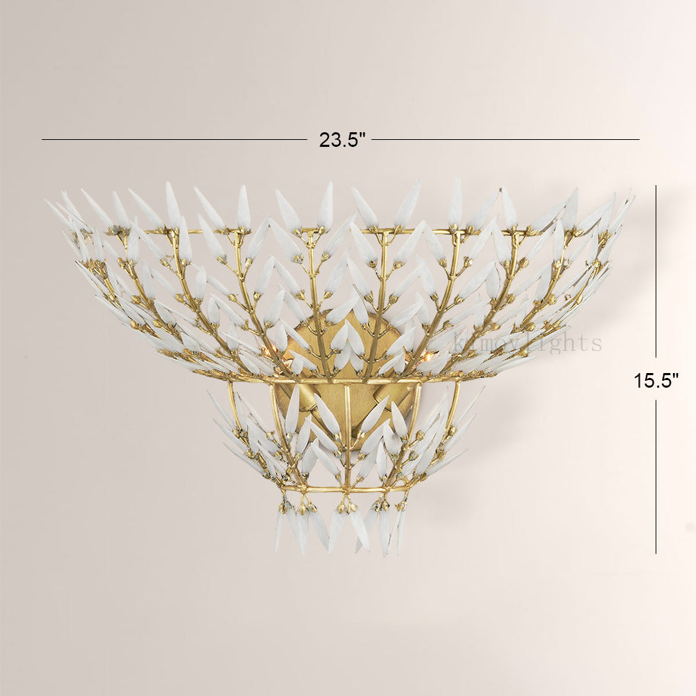 The Morvida - series wall sconce features delicate glass leaf accents arranged on a polished brass branch frame, merging organic elegance and refined glamour. Its layered glass leaves diffuse soft, luminous light, while the brass structure adds warm, elevated charm—making it a sophisticated accent for upscale American bedrooms, hallways, or living spaces, elevating high-end interiors with nature-inspired luxury.