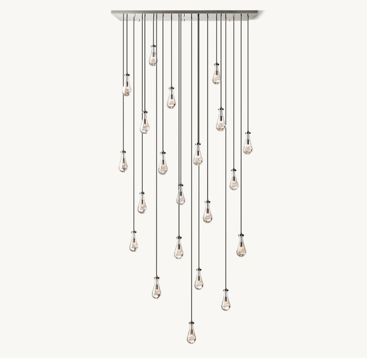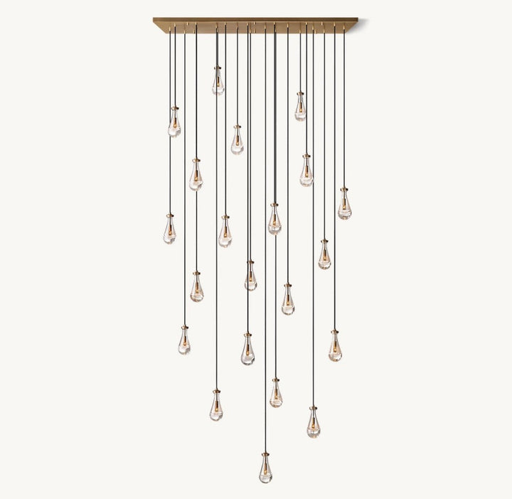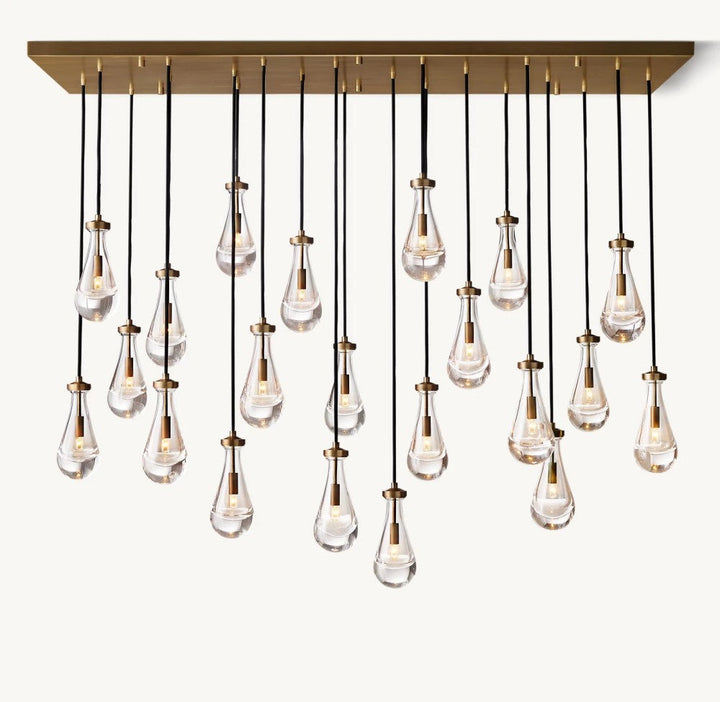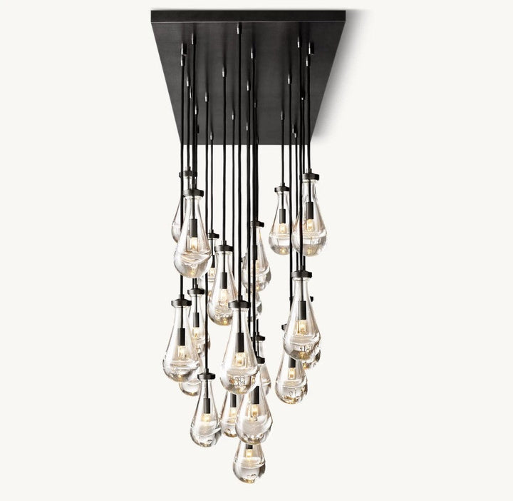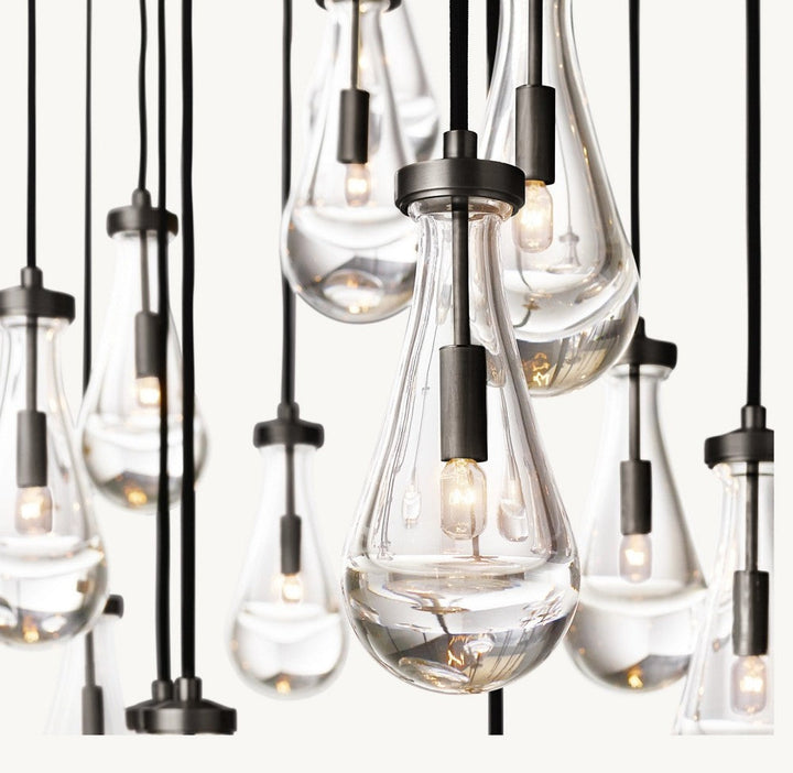 Evoking the quiet beauty of rainfall, this chandelier features hand-blown solid glass drops suspended from slim black cords. Each droplet encases a warm E12 bulb, casting soft, rippling light across the room. Finished with solid brass hardware and available in three refined tones, it’s a sculptural statement for any elegant space.