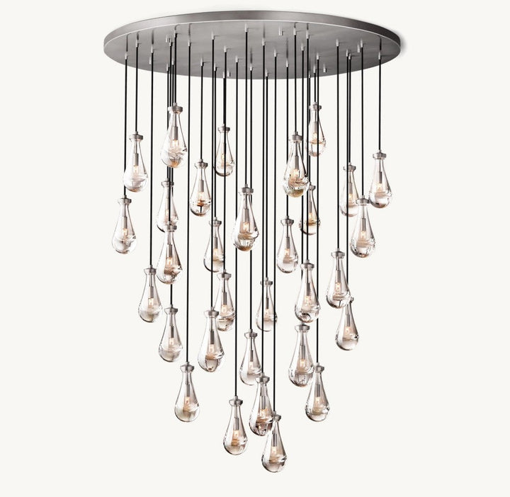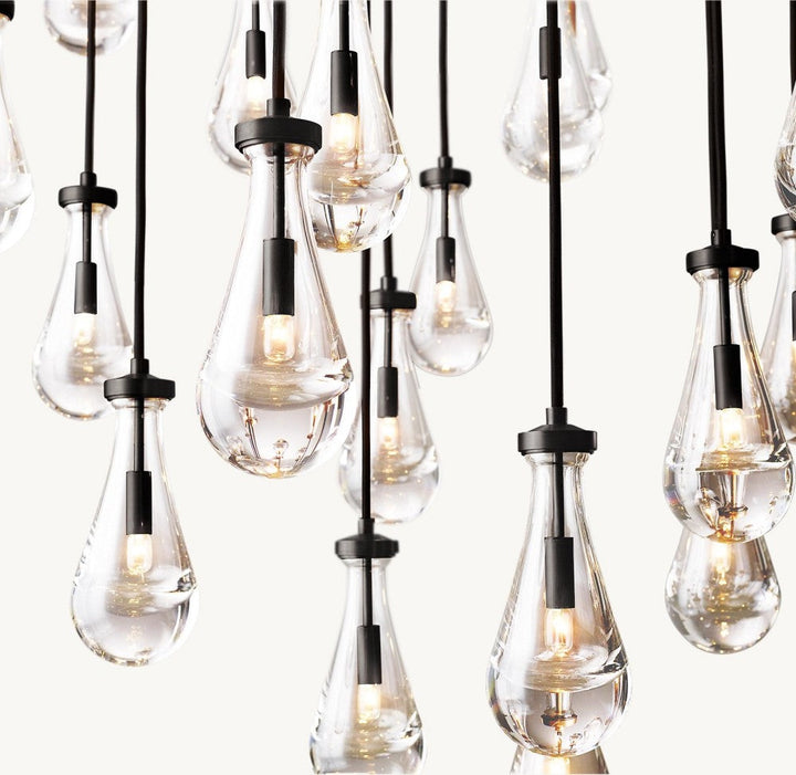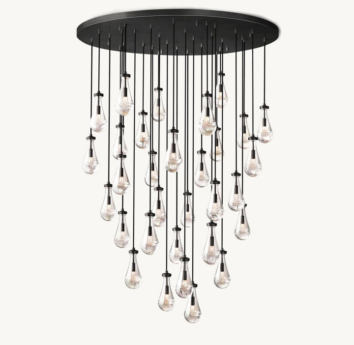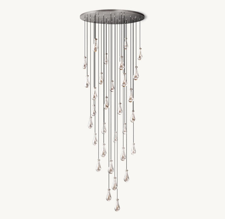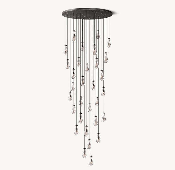 Evoking the quiet beauty of rainfall, this chandelier features hand-blown solid glass drops suspended from slim black cords. Each droplet encases a warm E12 bulb, casting soft, rippling light across the room. Finished with solid brass hardware and available in three refined tones, it’s a sculptural statement for any elegant space.