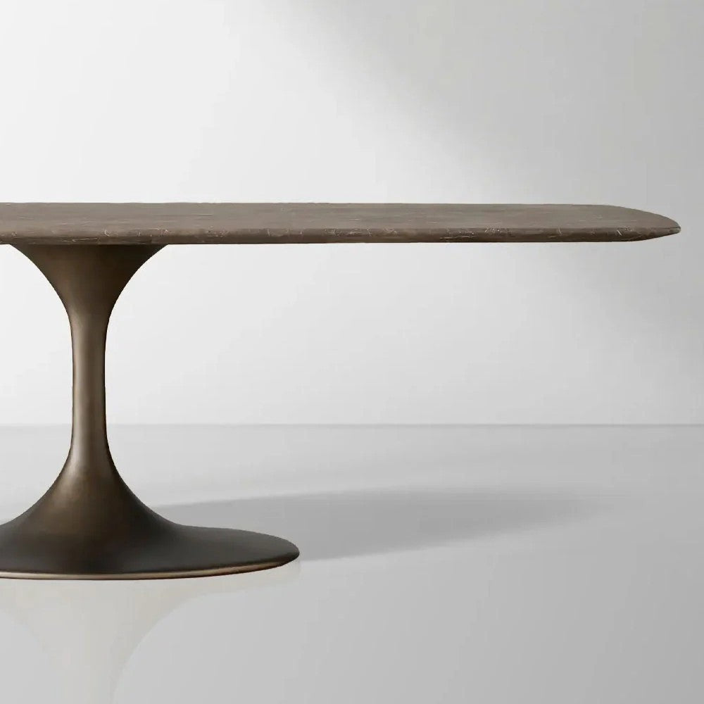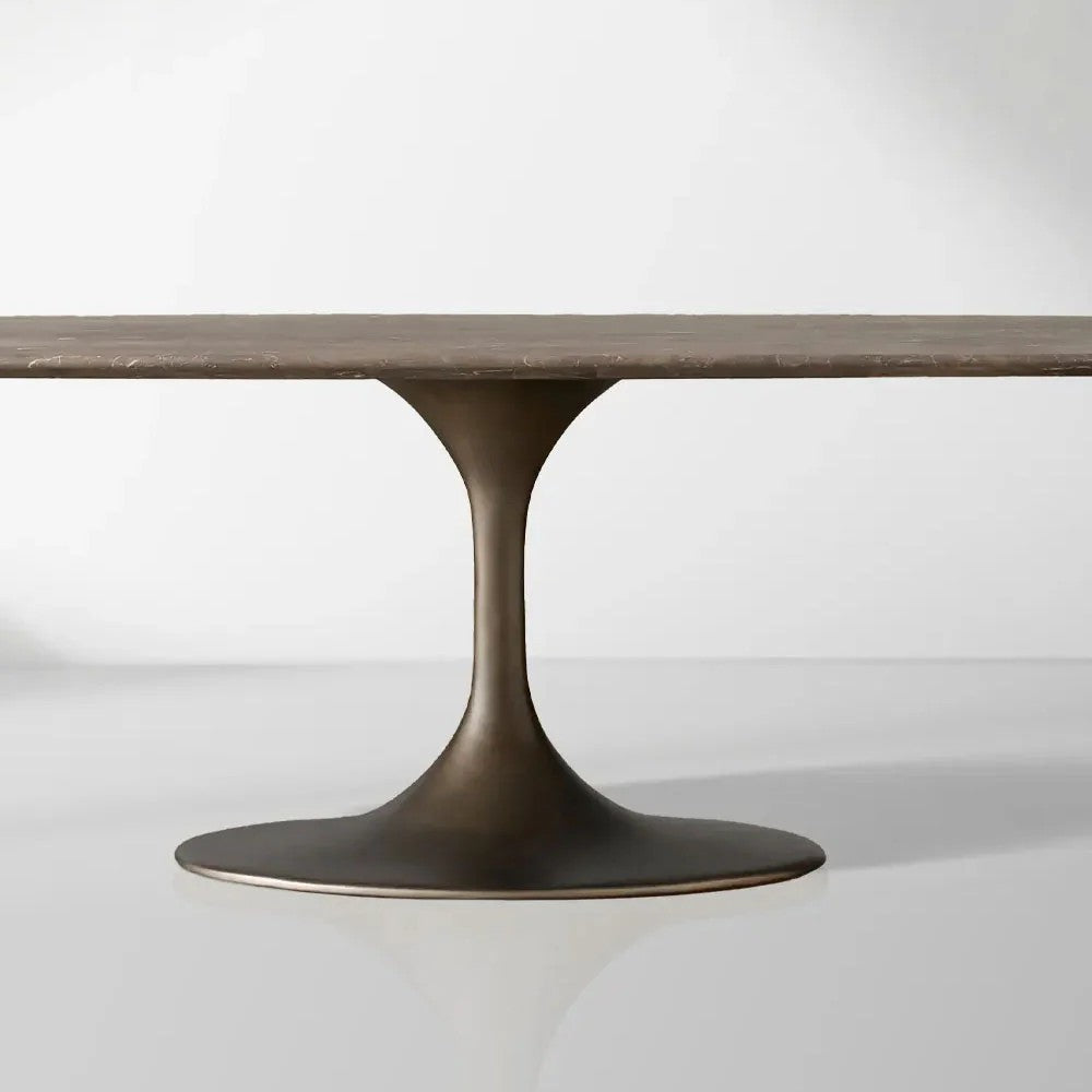 Choose from exquisite Carrara marble sourced from Italy, cream marble, or rich espresso brown stone. Each solid stone top is uniquely veined with natural variations, mineral deposits, and patterns, ensuring your table is one-of-a-kind. For enduring stability, the stone is securely attached to the Launette base with reinforced engineered hardwood joinery. The minimalist yet robust steel base provides a striking contrast to the organic stone, completing a look of refined industrial charm.