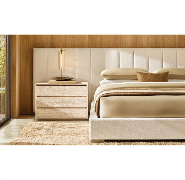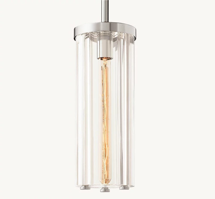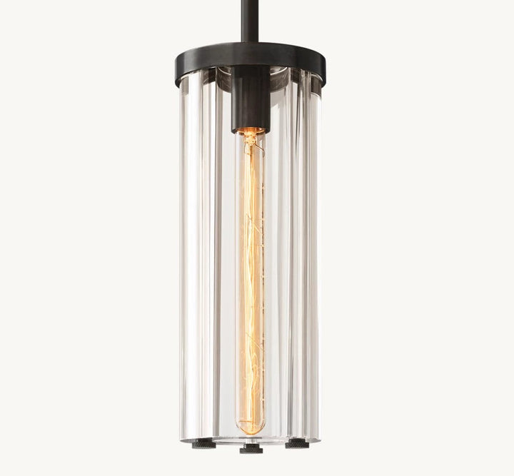 The Savoy Collection features a solid crystal block set in a brass frame. Carved with a concave channel, it reveals brilliance when lit and a weightless transparency when dark.