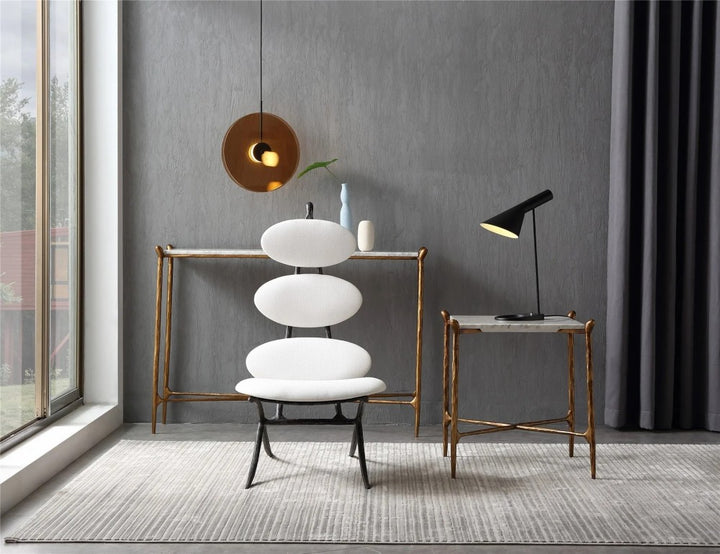 Our chair from the rustic sensibility of a hand-forged metal base with supple leather. Employing an ancient fabrication process, artisans hand hammer the metal bars to reveal an alive, imperfect and organic texture, a counterpoint to the frame's slender, tapered silhouette.