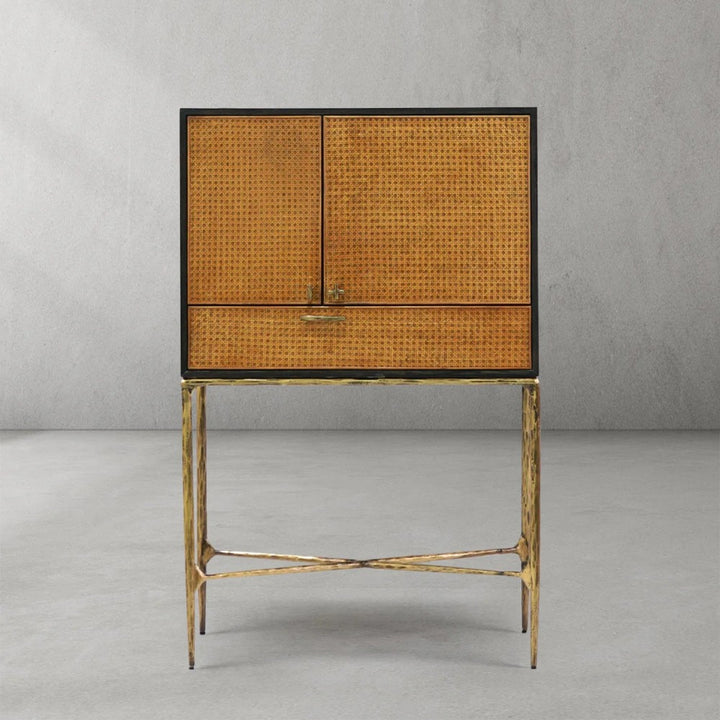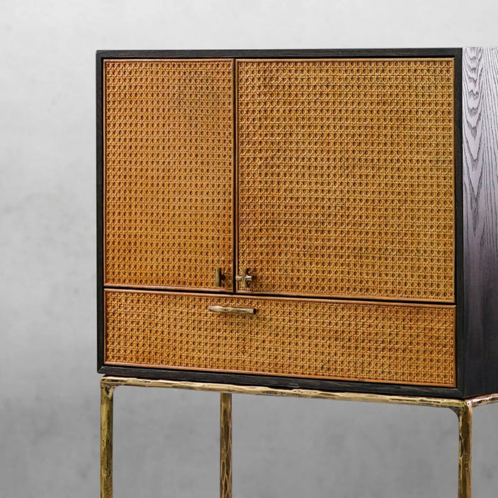 Thades side cabinet are stunning pieces that will add a stylish and sophisticated touch to your living space. Blends the rustic feel of hand-forged metal with soft organic rattan panels. Using an ancient manufacturing process, the artisans hammer the metal rods by hand to reveal a fresh, organic texture. This fully functional side cabinet stores your essentials.