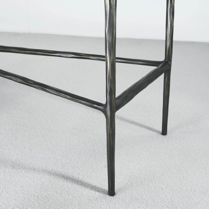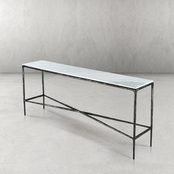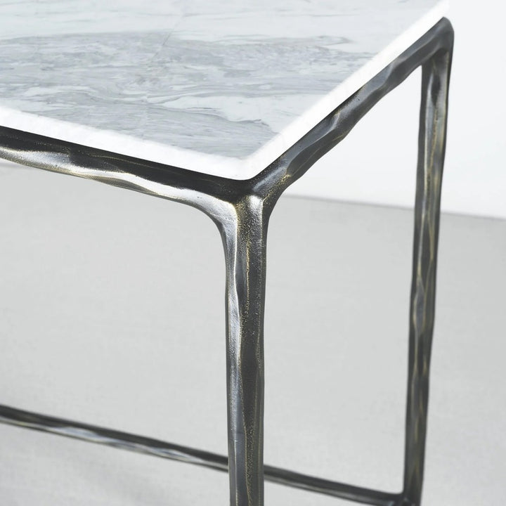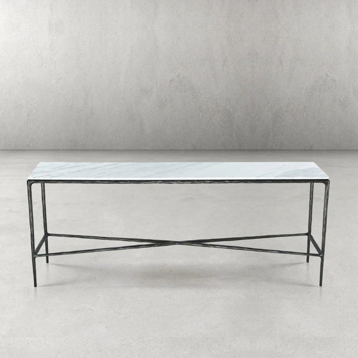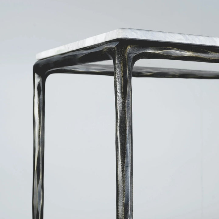 Our collection by the rustic sensibility of hand-forged metal with cool Italian Carrara marble. Employing an ancient fabrication process, artisans hand hammer the metal bars to reveal an alive, imperfect and organic texture. A layer of lacquer has been added to the surface of the stone tabletop for protection.