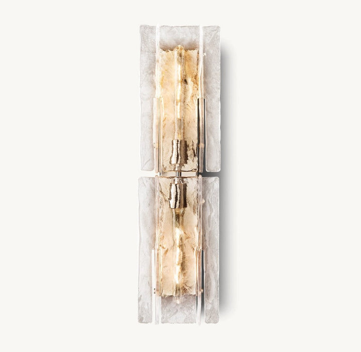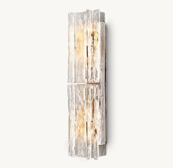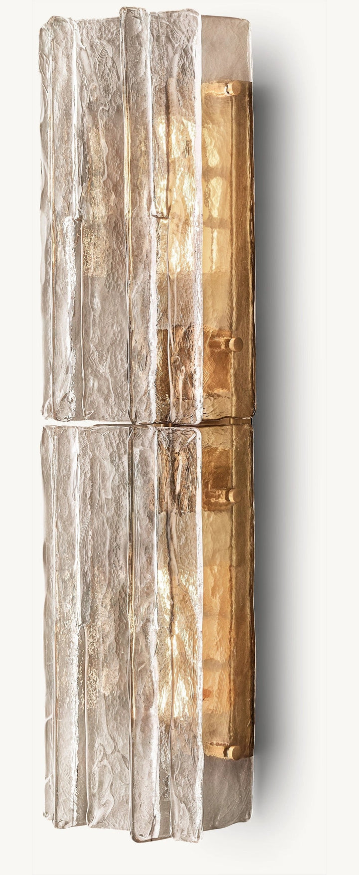 Crafted of solid cast glass, our Trama collection's interlocking planes recall the geometric precision of the midcentury International Style. A study in repetition and rhythm, the form employs open space to lend a weightless feel. Gently rounded corners on the fluid, rippled panes subtly soften the outline, while diffused light glows from within.