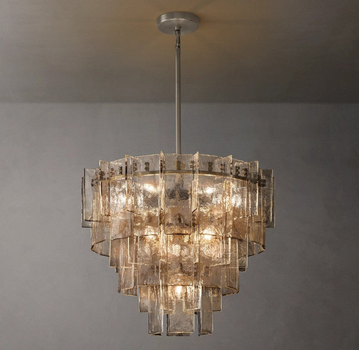 Crafted of solid cast glass, our Trama collection's interlocking planes recall the geometric precision of the midcentury International Style. A study in repetition and rhythm, the form employs open space to lend a weightless feel. Gently rounded corners on the fluid, rippled panes subtly soften the outline, while diffused light glows from within.